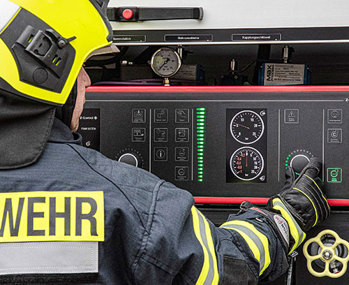 The Z-Control pump control station includes, among other things, the illuminated STAR-KNOBS from OKW. The control panel enables glove-friendly and intuitive operation, through which all discharge functions can be executed at the push of a button. In addition, Z-Control provides an overview of the work processes, the operating status, the water and foam concentrate flow rate as well as the proportioning rate. Through light color and light animation safe operation is possible: only the functions that can be activated will be visible on the interface.