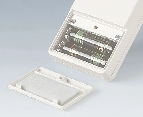 DATEC-POCKET-BOX L Robust pocket box without sealing. Recessed control area for membrane keyboards. Screw pillars prepared for mounting PCBs in the top and base. Battery compartment accessible from the outside with locking battery compartment lid in case bottom. Battery compartment for 1 x 9 V flat battery or 2 x 1.5 V mignon cell (AA).