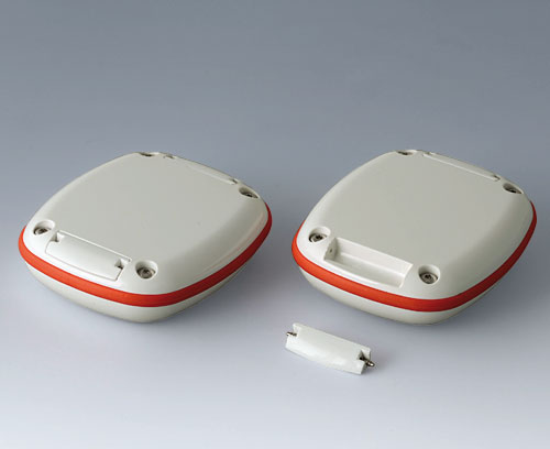 Modern small enclosure specifically designed for "wearable technologies". Three-part design consisting of highly polished top and bottom parts and a matt TPV sealing ring.