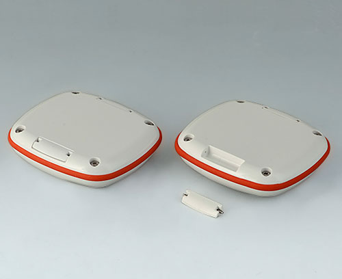 Modern small enclosure specifically designed for "wearable technologies". Three-part design consisting of highly polished top and bottom parts and a matt TPV sealing ring.