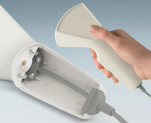 SMART-CASE M, Vers. VI Ergonomic handheld case composed of two parts. Location at the front along with a screw in the center of the case. Possiblities for fixing PCBs in top and base part. Polished front area for utmost effectiveness when exposed to infra-red light.