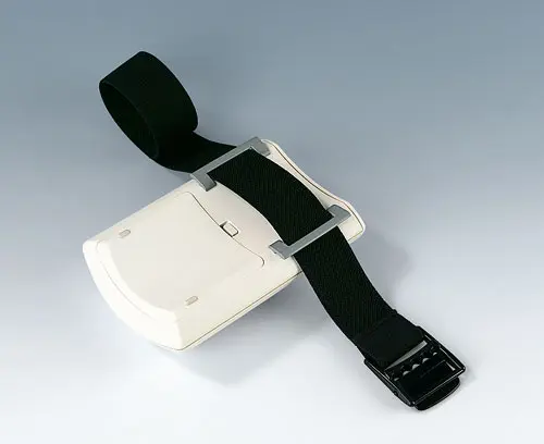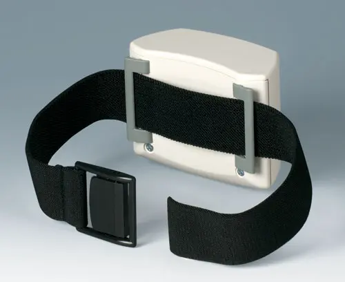ERGO-CASE XS Three-part enclosure in ergonomic design to wear on the body. Wrist strap as accessories. TPE ring for a pleasant touch sensation. Fastening pillars and fixing supports for PCBs and integrated parts in the bottom and top part. Recessed operating area for the protection of the membrane keyboard.