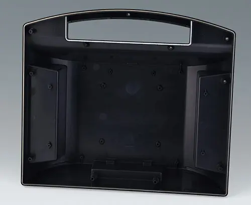 CARRYTEC L Robust plastic enclosure with handle. Recessed surface for membrane keyboards. Flat, impact-protected areas on the bottom part of the enclosure for installing interfaces, plug-in connectors, peripheral equipment etc. Interface installation at the rear, e.g. support arm applications, ensures orderly cable routing through enclosure connection, mounting points match the hole patterns of VESA MIS-D 100. Attachment domes for PCBs and components in the top and bottom parts. Stations for easy transmission of data and charging current, as well as battery compartment 5 x AA (processing on request) as an accessory.