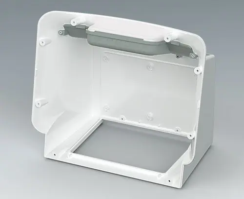 Order with COMMUNITEC M basic housing. Features a recessed area for protecting membrane keypads and integrating large-format displays up to 14", with a flat area below for front-mounted control elements and connectors. Includes integrated fastening pillars for PCBs or mounting plates. The operating panel is installed from the rear.
