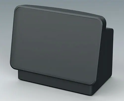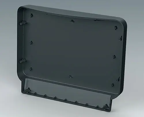 Order with COMMUNITEC M basic housing. Features a recessed area for protecting membrane keypads and integrating large-format displays up to 14", with a flat area below for front-mounted control elements and connectors. Includes integrated fastening pillars for PCBs or mounting plates. The operating panel is installed from the rear.