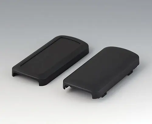 Basic enclosure, 2-piece, with convex and flattened shell. Recessed surface to protect the membrane keyboard, decor foil or label. Both end sides open, and end parts or the cable gland kits can optionally be mounted there (accessories). Four attachment domes for mounting a PCB in the flattened shell. Plastic enclosure snaps together.