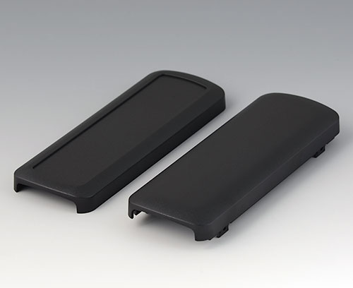 Basic enclosure, 2-piece, with convex and flattened shell. Recessed surface to protect the membrane keyboard, decor foil or label. Both end sides open, and end parts or the cable gland kits can optionally be mounted there (accessories). Four attachment domes for mounting a PCB in the flattened shell. Plastic enclosure snaps together.