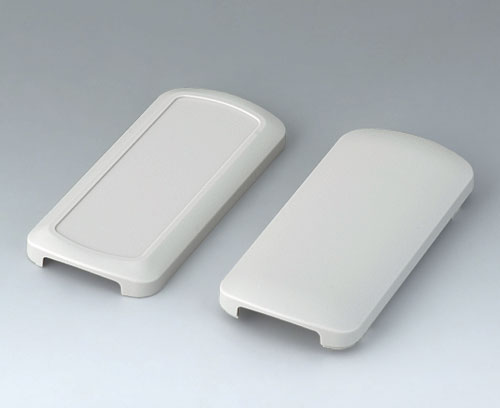 Basic enclosure, 2-piece, with convex and flattened shell. Recessed surface to protect the membrane keyboard, decor foil or label. Both end sides open, and end parts or the cable gland kits can optionally be mounted there (accessories). Four attachment domes for mounting a PCB in the flattened shell. Plastic enclosure snaps together.