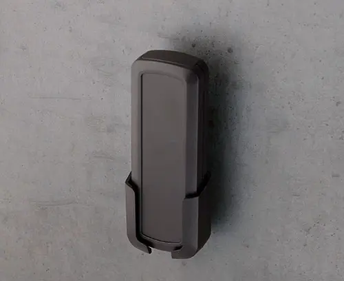 Special holder for CONNECT S for the secure storage of wired and wireless mobile devices. With large recess for plug-in connections. The holder is mounted on the wall or on other components with standard screws with head diameters of 0.217" to 0.276".
