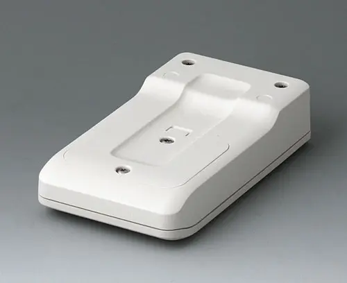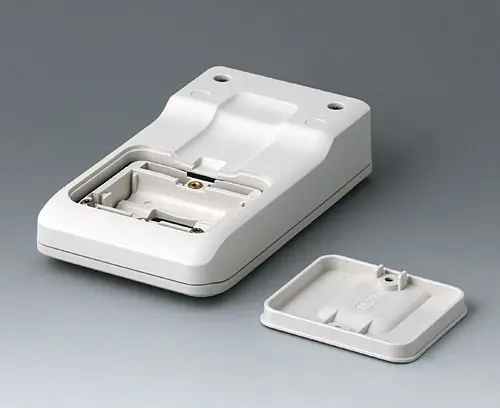 3-part compact hand-held enclosure with sealing and with an ergonomic, robust design. Ideal for miniaturised electronics applications. Secure grip through finger recess in the bottom part and center of gravity near the body. With a battery compartment, accessible from the outside, for 3 x 1.5 V AAA batteries. Recessed user area to protect the operating elements. Attachment domes for PCBs and components in the top and bottom parts.