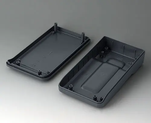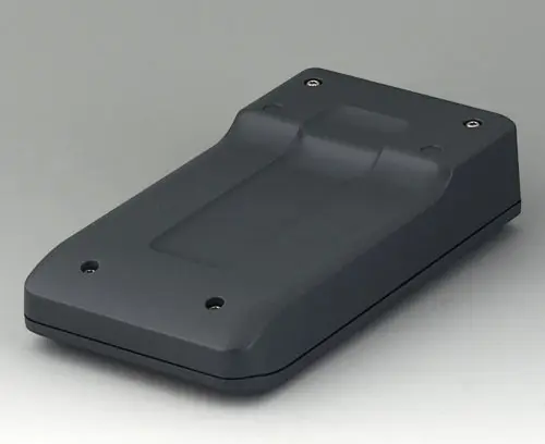 2-part compact hand-held enclosure with an ergonomic, robust design. Secure grip through finger recess in the bottom part. Recessed user area to protect the operating elements. Attachment domes for PCBs and components in the top and bottom parts.