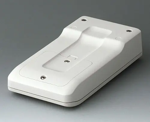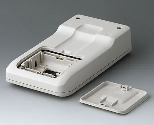 3-part compact hand-held enclosure with sealing and with an ergonomic, robust design. Ideal for miniaturised electronics applications. Secure grip through finger recess in the bottom part and center of gravity near the body. With a battery compartment, accessible from the outside, for 3 x 1.5 V AA batteries. Recessed user area to protect the operating elements. Attachment domes for PCBs and components in the top and bottom parts.