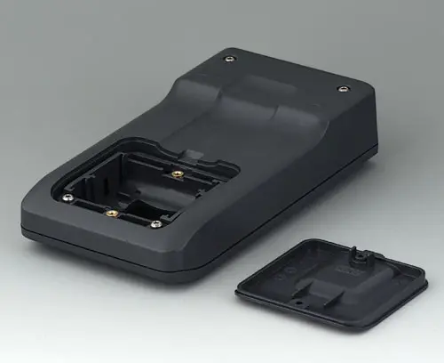 3-part compact hand-held enclosure with sealing and with an ergonomic, robust design. Ideal for miniaturised electronics applications. Secure grip through finger recess in the bottom part and center of gravity near the body. With a battery compartment, accessible from the outside, for 3 x 1.5 V AA batteries. Recessed user area to protect the operating elements. Attachment domes for PCBs and components in the top and bottom parts.