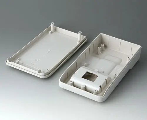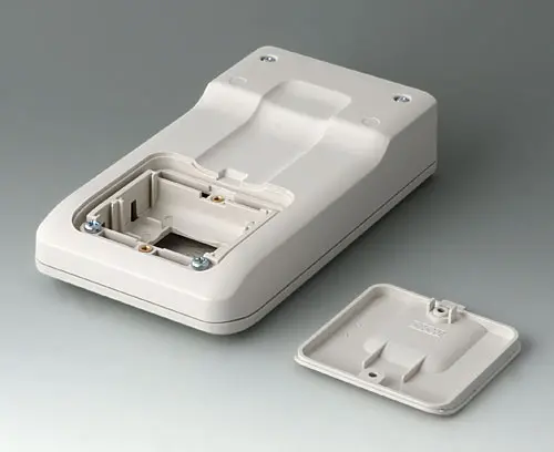3-part compact hand-held enclosure with an ergonomic, robust design. Ideal for miniaturised electronics applications. Secure grip through finger recess in the bottom part and center of gravity near the body. With a battery compartment, accessible from the outside, for 3 x 1.5 V AA batteries. Recessed user area to protect the operating elements. Attachment domes for PCBs and components in the top and bottom parts.