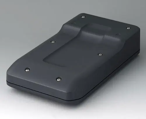 2-part compact hand-held enclosure with sealing and with an ergonomic, robust design. Secure grip through finger recess in the bottom part. Recessed user area to protect the operating elements. Attachment domes for PCBs and components in the top and bottom parts.