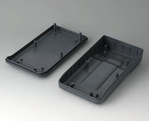 2-part compact hand-held enclosure with an ergonomic, robust design. Secure grip through finger recess in the bottom part. Recessed user area to protect the operating elements. Attachment domes for PCBs and components in the top and bottom parts.