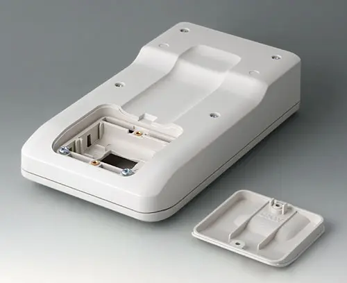 3-part compact hand-held enclosure with an ergonomic, robust design. Ideal for miniaturised electronics applications. Secure grip through finger recess in the bottom part and center of gravity near the body. With a battery compartment, accessible from the outside, for 3 x 1.5 V AA batteries. Recessed user area to protect the operating elements. Attachment domes for PCBs and components in the top and bottom parts.