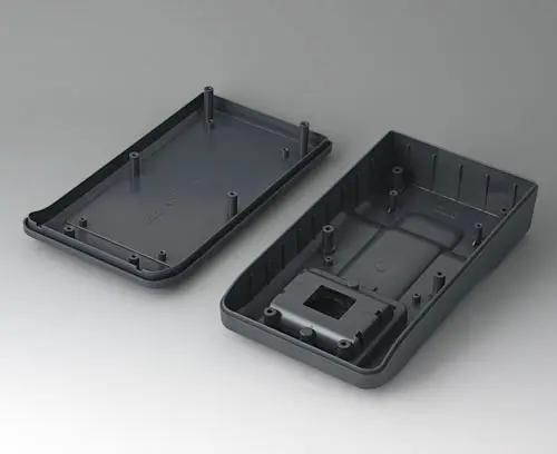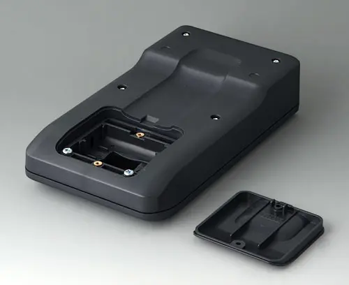 3-part compact hand-held enclosure with an ergonomic, robust design. Ideal for miniaturised electronics applications. Secure grip through finger recess in the bottom part and center of gravity near the body. With a battery compartment, accessible from the outside, for 3 x 1.5 V AA batteries. Recessed user area to protect the operating elements. Attachment domes for PCBs and components in the top and bottom parts.