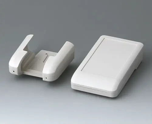 DATEC-COMPACT S 2-part compact hand-held enclosure with an ergonomic, robust design. Secure grip through finger recess in the bottom part. Recessed user area to protect the operating elements. Attachment domes for PCBs and components in the top and bottom parts.