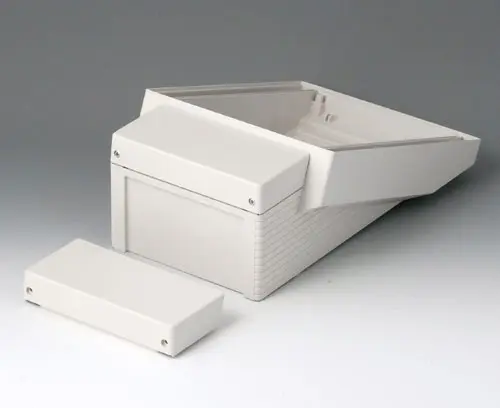 DATEC-TERMINAL M, Vers. I Basic case with terminal compartment. Ergonomically inclined operating area can be used with front panel, profile plate or cover. Suitable to accommodate Eurocards 100 x 160 mm.