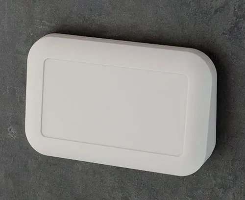 2-part plastic enclosure with operating panel ergonomically inclined by 12°. Top part with recessed area for protecting a membrane keypad or decor foil. Robust design. Case assembled with Torx drive stainless steel screws. Seal for protection class IP 65 available as an accessory. Fastening pillars for PCBs and components in the top and bottom parts.