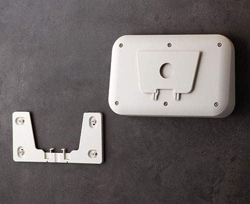 The adapter (4.173" x 2.953") is attached to the bottom part of the enclosure by 4 screws. 4 boreholes ø 0.138" are required. The adapter makes it possible to clip the enclosure quickly and easily into the holder mounted on the wall. Optionally, the parts can be secured with 2 screws, thus offering additional protection against removal.
