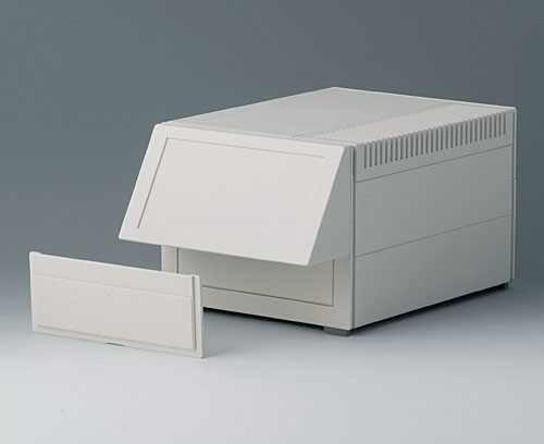 When using the MEDITEC-cases with 1 intermediate part each right and left hand (case height = 4.882") and operating front. The front cover locks the access to the case's inside; usable on top of or under the operaring front alternatively.