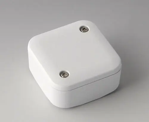 2-part plastic enclosure with high top part, for universal use. Robust design with proven tongue and groove connection. Assembled with Torx stainless steel screws. Fixing supports for PCBs and components in the top and bottom parts. Fastening on the supports is by means of hot caulking.