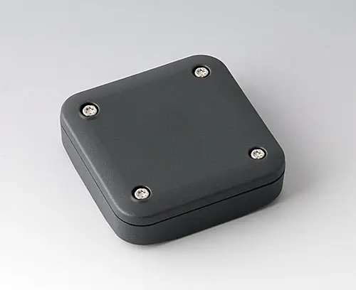 2-part plastic enclosure with flat top part, for universal use. Robust design with proven tongue and groove connection. Assembled with Torx stainless steel screws. Fixing supports for PCBs and components in the top and bottom parts. Fastening on the supports is by means of hot caulking.