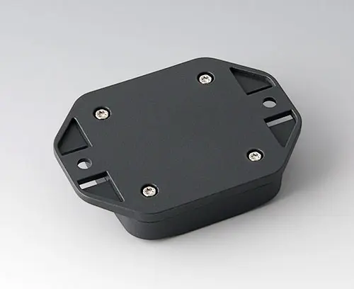 2-part plastic enclosure with flat top part. Bottom part with integrated flanges for fast wall mounting or for mounting on rails and tube profiles or on masts. Robust design with proven tongue and groove connection. Assembled with Torx stainless steel screws. Fixing supports for PCBs and components in the top and bottom parts. Fastening on the supports is by means of hot caulking.