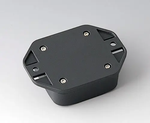 2-part plastic enclosure with high top part. Bottom part with integrated flanges for fast wall mounting or for mounting on rails and tube profiles or on masts. Robust design with proven tongue and groove connection. Assembled with Torx stainless steel screws. Fixing supports for PCBs and components in the top and bottom parts. Fastening on the supports is by means of hot caulking.