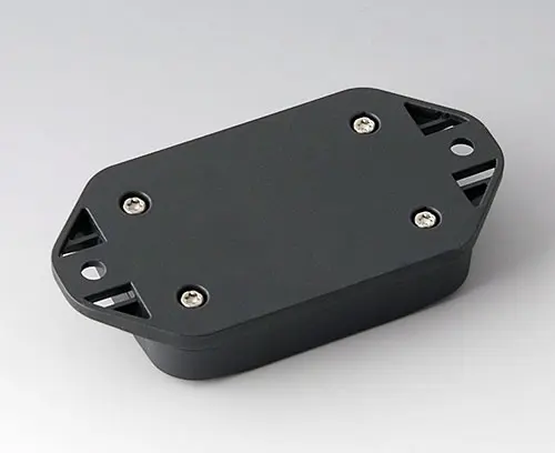 2-part plastic enclosure with flat top part. Bottom part with integrated flanges for fast wall mounting or for mounting on rails and tube profiles or on masts. Robust design with proven tongue and groove connection. Assembled with Torx stainless steel screws. Fixing supports for PCBs and components in the top and bottom parts. Fastening on the supports is by means of hot caulking.