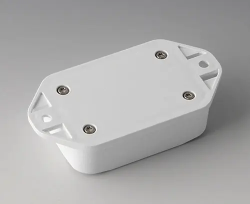 2-part plastic enclosure with high top part. Bottom part with integrated flanges for fast wall mounting or for mounting on rails and tube profiles or on masts. Robust design with proven tongue and groove connection. Assembled with Torx stainless steel screws. Fixing supports for PCBs and components in the top and bottom parts. Fastening on the supports is by means of hot caulking.
