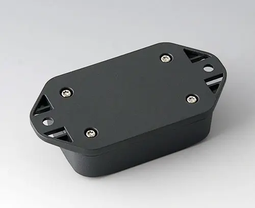 2-part plastic enclosure with high top part. Bottom part with integrated flanges for fast wall mounting or for mounting on rails and tube profiles or on masts. Robust design with proven tongue and groove connection. Assembled with Torx stainless steel screws. Fixing supports for PCBs and components in the top and bottom parts. Fastening on the supports is by means of hot caulking.