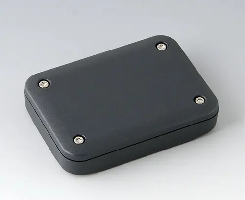 2-part plastic enclosure with flat top part, for universal use. Robust design with proven tongue and groove connection. Assembled with Torx stainless steel screws. Fixing supports for PCBs and components in the top and bottom parts. Fastening on the supports is by means of hot caulking.