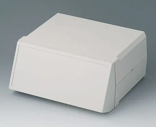 MOTEC L, high/high Desk top case with high base and top part. Screwless mounting of the shells. Front and rear part open. Screw towers for PCBs and vertical guides for mounting panels. Front and rear panels to slide in as accessory.