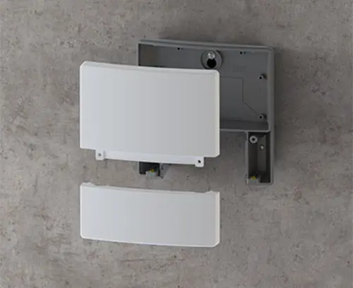 Three-part enclosure with a uniform appearance thanks to concealed screw connections. Modern color combination of light gray and lava. 2 PCB levels with 4 attachment domes each in the electronics compartment. Can also be used out of doors thanks to the high-quality ASA+PC-FR material.