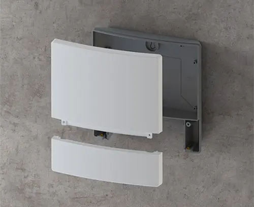 Three-part enclosure with a uniform appearance thanks to concealed screw connections. Modern color combination of light gray and lava. 2 PCB levels with 4 attachment domes each in the electronics compartment. Can also be used out of doors thanks to the high-quality ASA+PC-FR material.