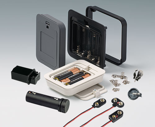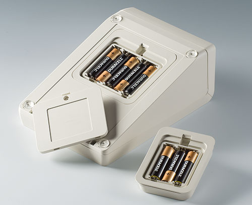 Battery compartment kit, 5 x AA For direct installation in front panels or case walls. Easy battery replacement. Battery compartment lid for snap-in and/or screw-on mounting.