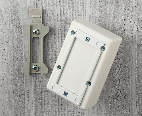 The adapter (1.77" x 2.28") is attached to the enclosure with a double-sided adhesive foil*. This makes it possible to mount the enclosure quickly and easily on the holder, which can be screwed to the wall - attachment with adhesive foils* is optionally also possible here (separate article available as an accessory). Removal protection by means of a locking pin.