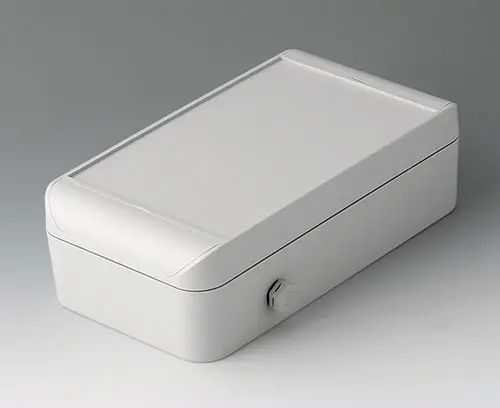 Two-piece plastic enclosure with sealing foamed into the top part. Recessed panel to protect membrane keyboards and design foils. Attachment domes for DIN rails, PCBs and mounting plates. Rational stainless steel quick-action lock outside the sealing area.