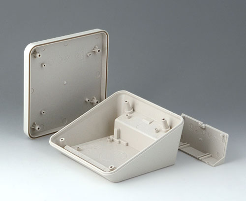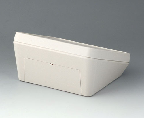 Modern three piece plastic enclosure with an ergonomically inclined operating panel. The snap-on cover included in the supply makes it possible to close the deep recessed interface area at the rear both visually and/or to install additional electronics in a separate area. Fastening pillars for PCBs and components in the top and bottom parts. Wall suspension element and sealing (to raise the protection class up to IP 65) included in the range of accessories. Hidden stainless steel assembly screws with secure Torx heads. Can also be used outdoors thanks to the high-quality material and the robust design.
