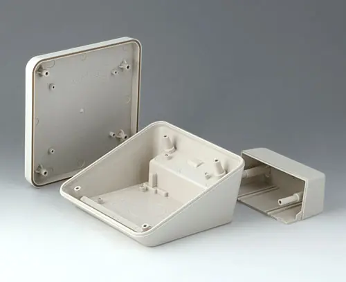 Modern three piece plastic enclosure with an ergonomically inclined operating panel. The deep cover included in the supply provides additional space in a separate area. Fastening pillars for PCBs and components in the top and bottom parts. Wall suspension element and sealing (to raise the protection class up to IP 65) included in the range of accessories. Hidden stainless steel assembly screws with secure Torx heads. Can also be used outdoors thanks to the high-quality material and the robust design.