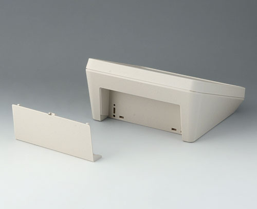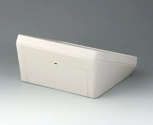 Modern three piece plastic enclosure with an ergonomically inclined operating panel. The snap-on cover included in the supply makes it possible to close the deep recessed interface area at the rear both visually and/or to install additional electronics in a separate area. Fastening pillars for PCBs and components in the top and bottom parts. Wall suspension element and sealing (to raise the protection class up to IP 65) included in the range of accessories. Hidden stainless steel assembly screws with secure Torx heads. Can also be used outdoors thanks to the high-quality material and the robust design.