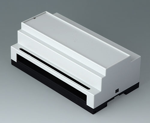 Enclosure for applications where larger components/assemblies need to be fitted inside. Different connection levels flat or high for individual configuration. Case corresponds to DIN 43880, size 1. Simple and quick assembly by locking onto DIN-rails EN 60715 TH35. Base part with fixing pillars for the PCB. Vertical and horizontal guides for additional PCBs.