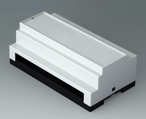 Enclosure for applications where larger components/assemblies need to be fitted inside. Different connection levels flat or high for individual configuration. Case corresponds to DIN 43880, size 1. Simple and quick assembly by locking onto DIN-rails EN 60715 TH35. Base part with fixing pillars for the PCB. Vertical and horizontal guides for additional PCBs.