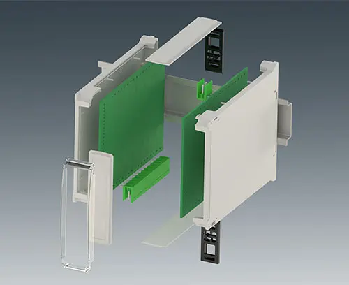 DIN rail enclosure with pluggable side panels and front panel. Connection options on three sides. For plug headers max. 2 x 16-pin, 5.08, fixed or pluggable. Simple and quick assembly by locking onto DIN rails EN 60715 TH35. The panel version provides simple and flexible installation of the electronics as well as efficient, screwless case assembly.