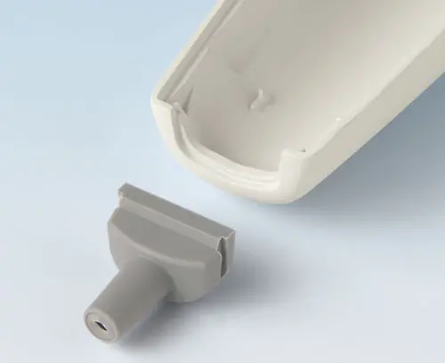 SENSO-CASE M Ergonomic plastic enclosure for single-handed operation. Recessed control panel for operating elements or display modules. Fastening pillars for PCBs in the top part. Space for 9 V flat battery or battery compartment 2 x AA (accessory). Cable strain relief (acc.) alternatively applicable.