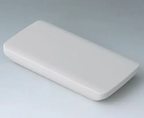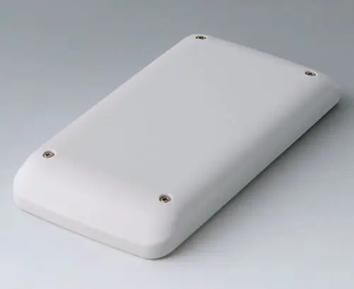 2-piece handheld enclosure, flat design, with a large operating panel of up to 4" (10 cm). The contours of the enclosure are rounded along the sides - comfortable to hold and easy to operate. Flat operating panel for individual design and arrangement of operating and display elements of all kinds. Fastening pillars for mounting PCBs in top and bottom parts. Seal for protection class IP 65 available as accessory.