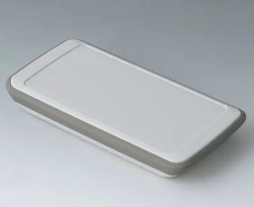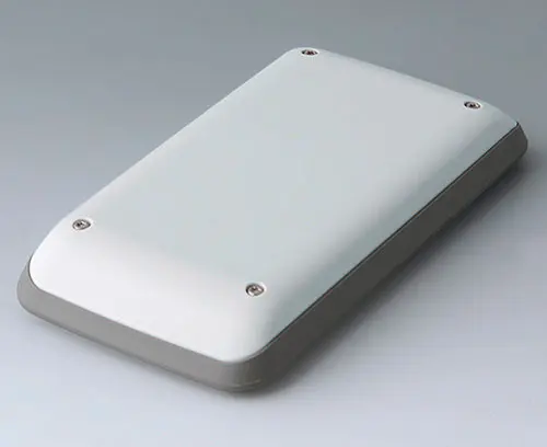3-piece handheld enclosure with TPE intermediate ring, compact design, with a large operating panel of up to 4" (10 cm). Comfortable grip thanks to enclosure contours that are rounded along the sides and intermediate ring made of TPE, which also serves as impact protection and as a sealing ring for protection class IP 54. Recessed operating panel for applications with decorative product label. Fastening pillars for mounting PCBs in top and bottom parts.